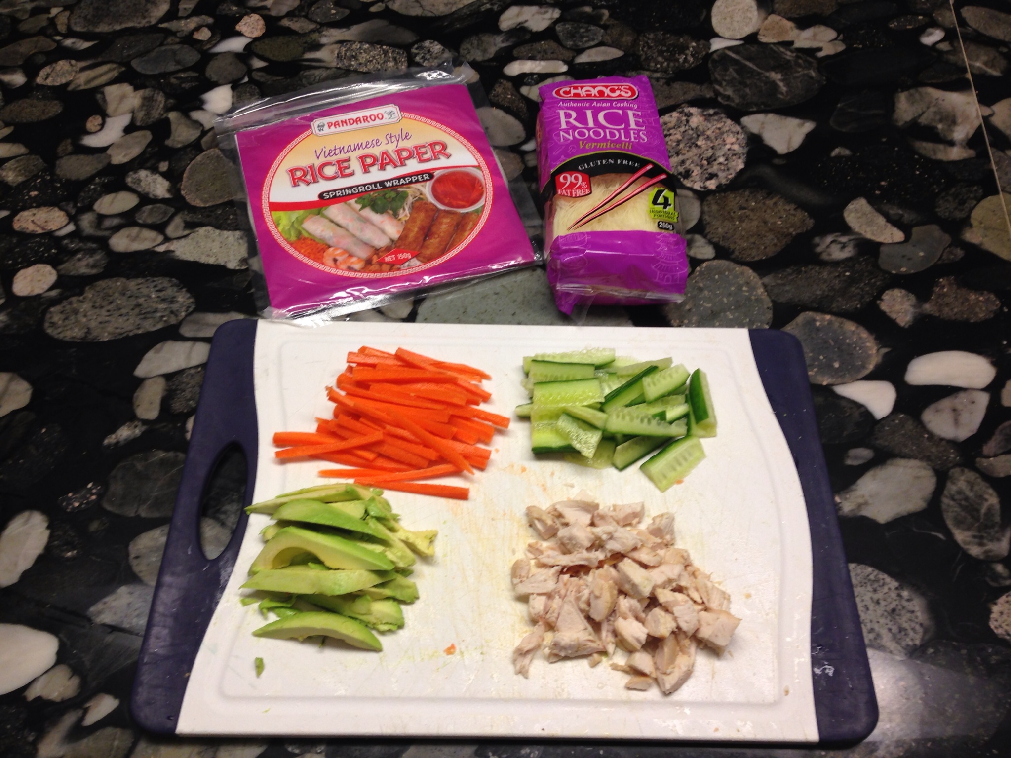 Rice paper rolls are a great way to use up whatever you’ve got in the fridge. I carved up a roast chicken and chopped up some veggies for a simple but yummy chicken, avocado, cucumber and carrot roll.